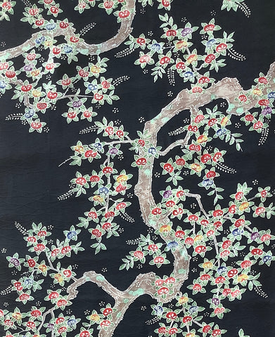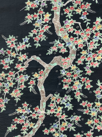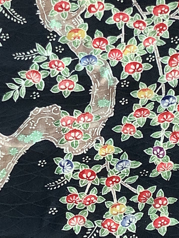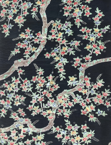 Fabric Description:  Light to medium weight silk (not translucent) is a 1980s piece from a woman's kimono; the fabric background is black  with interwoven classical  waves designs are slightly raised(textured);  the design are of stylized peach tree in bloom with peaches in various shades of red-peach, with a few blue ones randomly placed; The tree branches are a soft brown with cream; other colors: earth tone, gblues, greens; designs on one side only; fabric has slight drape.
