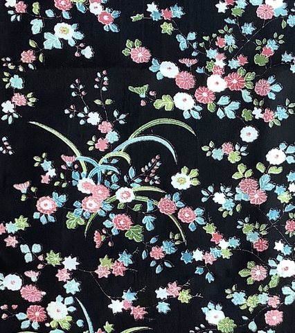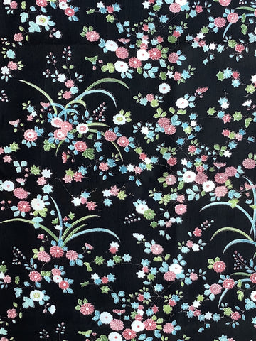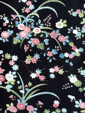Fabric Description:  Light to medium weight silk (minimally translucent) is a 1980s piece from a woman's kimono; the fabric background is black;  the designs are of many types of classic Japanese flower types (chrysanthemums, maple leaves, peonies, others),  with iris blades; All the flowers are less than half an inch/12.7mm, so we might call this a komon type;  most colors are light and pastels;other colors: mauve, earth tone, blues, greens; designs on one side only; fabric has slight drape.
