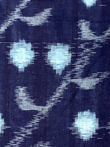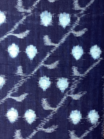 Fabric Description: Deadstock, never used, Japanese vintage Kasuri (ikat) cotton fabric from the 1960s; fabric is thin/translucent, stiff with background color of indigo-blue/black with figures/designs in pale blue, light blue-gray; this is of the type called E-Gasuri (lit. picture-kasuri) because the kasuri is dyed-woven with images, in this case, of fruit on tree branches; The fruit elements average 1.5 inches / 38.1cm at largest dimension; Note the branches with fruit run diagonally in parallel - somewhat unusual; please see close-ups; same on both sides.