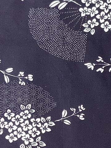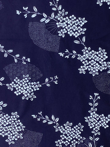 Fabric Description: Lightweight minimally translucent solid indigo-blue & white traditional cotton yukata (summer kimono) fabric with foreground designs of flowers and stylized, pixelated open fans; fabric looks the same on both sides; the fabric is very slightly stiff but softens with wash (Hand-wash separately, luke-warm water-- see our FAQ Pages for cleaning tips).