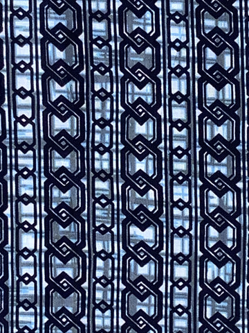 Fabric Type: Dark indigo-blue(almost black) as dominant foreground color design, with background being off-white and several shades of blue-gray in geometric mesh geometric patterns, only partially seen; The main foreground pattern is of evenly spaced parallel bands, average i inch / 2.54 cm wide, running lengthwise (vertically), within each band are several different styles interlocking chainlinks;