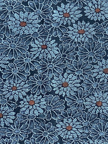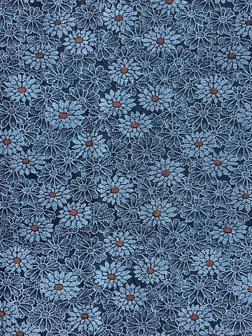 Fabric Description: 1960s Japanese kimono silk, black Lightweight, minimally translucent silk  taken from a woman's kimono; Fabric is solid black on reverse, but front is filled with smaller (1.5 inches / 38.1mm diameter) chrysanthemums and flowers' leaves in a blended color of light colonial-blue with gray tinge; also, many flowers have iron-red center accents; the designs are also done in pixelated way; Please view our closeup pictures; Fabric has no sheen.