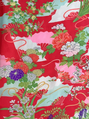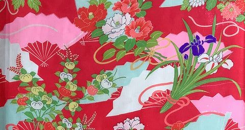 8076: 1960s Japanese Furisode Red Silk Fabric Piece 51", Retro,Sensu Fans, Multiple Flowers