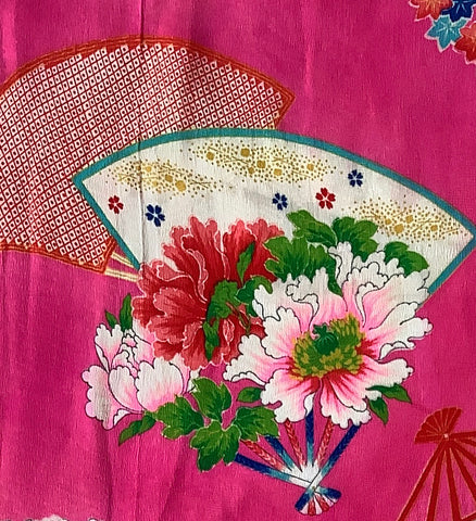 8078: 1930s-1950 Japanese Kimono Silk Fabric Piece 56", Retro,Floral, Fans, Royal Manors, More Arai-Hari