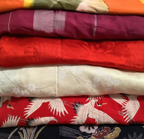 USES: Each bundle is unique, meant strictly for those wishing to create something new with - or from - them; some have used them as a canvas for dye-air painting accents, or for full re-dyeing, embroidering, or, altering or patching over flaws; There seems to be no limit to how our creative customers use these special old kimonos in ways that give them a new life, rather than these kimonos ending up in a dump somewhere.