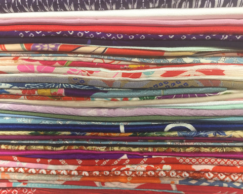 Great for quilters, crafts, designers, textile artists: We have accumulated these high-quality fine kimono silk swatch sampler pieces and make them available from time to time in addition to our other by-pound vintage kimono bundles.