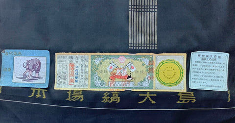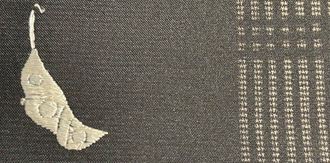 Note the brocaded figures randomly placed: these look like falling leaves to us, though one has a look of a butterfly, another of a peapod shape; these silver threaded figures are on both sides (Please see our closeups);motifs are the same on both sides; The start of this roll shows multiple authenticating labels of maker's name and factory(Honba), Kamimura; the first order of this fabric will receive the maker's mark label band (last images).