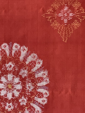 This thin, lightweight piece is translucent with alternating figures of diamond-shaped floral medallions that measure 4 inches/10.16cm X 3.5/8.89cm, and the large floral orbs, 6,75 inches/17.15cm diameter; Background color of the mud-dyed process is a copper-brown color, with motif figures using lighter & medium tone mustard colors (almost gold?), and white and off-whites as well in the larger figures;